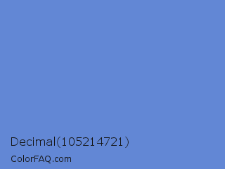 Decimal 105214721 Color is a light blue color and the nearest color is Danube #6093d1. Hex code #6287d5 and RGB value is rgb(98,135,213). In RGB color space, this color is composed of 38% red, 53% green, 84% blue, In CMYK color space, this color is composed of 54% cyan, 37% magenta, 0% yellow , 16% black , In HSL color space, this color has a hue angle of 221° , 58% saturation and 61% lightness.