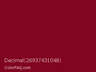 Decimal 26937431048 Color is a dark red color and the nearest color is Burgundy #800020. Hex code #810420 and RGB value is rgb(129,4,32). In RGB color space, this color is composed of 51% red, 2% green, 13% blue, In CMYK color space, this color is composed of 0% cyan, 97% magenta, 75% yellow , 49% black , In HSL color space, this color has a hue angle of 347° , 94% saturation and 26% lightness.