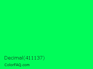 Decimal 411137 Color is a normal green color and the nearest color is Malachite #0bda51. Hex code #00fc59 and RGB value is rgb(0,252,89). In RGB color space, this color is composed of 0% red, 99% green, 35% blue, In CMYK color space, this color is composed of 100% cyan, 0% magenta, 65% yellow , 1% black , In HSL color space, this color has a hue angle of 141° , 100% saturation and 49% lightness.