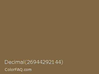 Decimal 26944292144 Color is a normal orange color and the nearest color is Raw Umber #826644. Hex code #816642 and RGB value is rgb(129,102,66). In RGB color space, this color is composed of 51% red, 40% green, 26% blue, In CMYK color space, this color is composed of 0% cyan, 21% magenta, 49% yellow , 49% black , In HSL color space, this color has a hue angle of 34° , 32% saturation and 38% lightness.