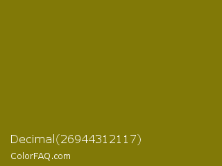 Decimal 26944312117 Color is a dark yellow color and the nearest color is Olive #808000. Hex code #817907 and RGB value is rgb(129,121,7). In RGB color space, this color is composed of 51% red, 47% green, 3% blue, In CMYK color space, this color is composed of 0% cyan, 6% magenta, 95% yellow , 49% black , In HSL color space, this color has a hue angle of 56° , 90% saturation and 27% lightness.