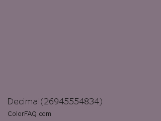 Decimal 26945554834 Color is a normal magenta color and the nearest color is Empress #817377. Hex code #837380 and RGB value is rgb(131,115,128). In RGB color space, this color is composed of 51% red, 45% green, 50% blue, In CMYK color space, this color is composed of 0% cyan, 12% magenta, 2% yellow , 49% black , In HSL color space, this color has a hue angle of 311° , 7% saturation and 48% lightness.