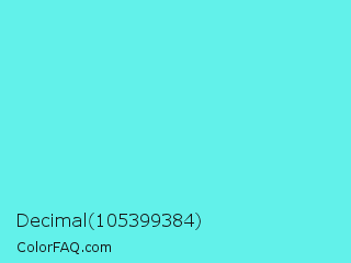 Decimal 105399384 Color is a light cyan color and the nearest color is Turquoise Blue #6cdae7. Hex code #62f1ea and RGB value is rgb(98,241,234). In RGB color space, this color is composed of 38% red, 95% green, 92% blue, In CMYK color space, this color is composed of 59% cyan, 0% magenta, 3% yellow , 5% black , In HSL color space, this color has a hue angle of 177° , 84% saturation and 66% lightness.