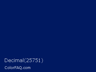 Decimal 25751 Color is a very dark blue color and the nearest color is Royal Blue #002366. Hex code #001961 and RGB value is rgb(0,25,97). In RGB color space, this color is composed of 0% red, 10% green, 38% blue, In CMYK color space, this color is composed of 100% cyan, 74% magenta, 0% yellow , 62% black , In HSL color space, this color has a hue angle of 225° , 100% saturation and 19% lightness.