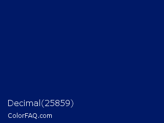 Decimal 25859 Color is a very dark blue color and the nearest color is Royal Blue #002366. Hex code #001967 and RGB value is rgb(0,25,103). In RGB color space, this color is composed of 0% red, 10% green, 40% blue, In CMYK color space, this color is composed of 100% cyan, 76% magenta, 0% yellow , 60% black , In HSL color space, this color has a hue angle of 225° , 100% saturation and 20% lightness.