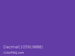 Decimal 105919888 Color is a normal violet color and the nearest color is Royal Purple #6b3fa0. Hex code #633ca6 and RGB value is rgb(99,60,166). In RGB color space, this color is composed of 39% red, 24% green, 65% blue, In CMYK color space, this color is composed of 40% cyan, 64% magenta, 0% yellow , 35% black , In HSL color space, this color has a hue angle of 262° , 47% saturation and 44% lightness.