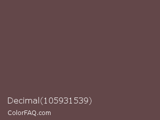Decimal 105931539 Color is a normal red color and the nearest color is Rose Ebony #674846. Hex code #634749 and RGB value is rgb(99,71,73). In RGB color space, this color is composed of 39% red, 28% green, 29% blue, In CMYK color space, this color is composed of 0% cyan, 28% magenta, 26% yellow , 61% black , In HSL color space, this color has a hue angle of 356° , 16% saturation and 33% lightness.