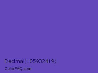 Decimal 105932419 Color is a normal indigo color and the nearest color is Plump Purple #5946b2. Hex code #6348bb and RGB value is rgb(99,72,187). In RGB color space, this color is composed of 39% red, 28% green, 73% blue, In CMYK color space, this color is composed of 47% cyan, 61% magenta, 0% yellow , 27% black , In HSL color space, this color has a hue angle of 254° , 46% saturation and 51% lightness.