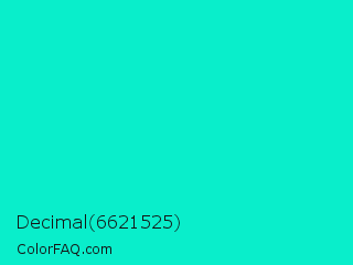 Decimal 6621525 Color is a normal cyan color and the nearest color is Bright Turquoise #08e8de. Hex code #09eecb and RGB value is rgb(9,238,203). In RGB color space, this color is composed of 4% red, 93% green, 80% blue, In CMYK color space, this color is composed of 96% cyan, 0% magenta, 15% yellow , 7% black , In HSL color space, this color has a hue angle of 171° , 93% saturation and 48% lightness.