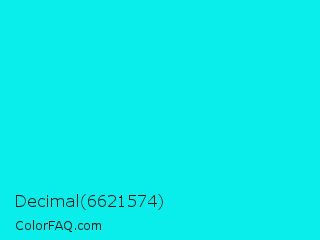 Decimal 6621574 Color is a normal cyan color and the nearest color is Bright Turquoise #08e8de. Hex code #09eeea and RGB value is rgb(9,238,234). In RGB color space, this color is composed of 4% red, 93% green, 92% blue, In CMYK color space, this color is composed of 96% cyan, 0% magenta, 2% yellow , 7% black , In HSL color space, this color has a hue angle of 179° , 93% saturation and 48% lightness.