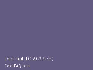 Decimal 105976976 Color is a normal indigo color and the nearest color is Dolphin #646077. Hex code #635b82 and RGB value is rgb(99,91,130). In RGB color space, this color is composed of 39% red, 36% green, 51% blue, In CMYK color space, this color is composed of 24% cyan, 30% magenta, 0% yellow , 49% black , In HSL color space, this color has a hue angle of 252° , 18% saturation and 43% lightness.