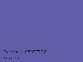 Decimal 105977732 Color is a normal indigo color and the nearest color is Scampi #675fa6. Hex code #635ca8 and RGB value is rgb(99,92,168). In RGB color space, this color is composed of 39% red, 36% green, 66% blue, In CMYK color space, this color is composed of 41% cyan, 45% magenta, 0% yellow , 34% black , In HSL color space, this color has a hue angle of 246° , 30% saturation and 51% lightness.