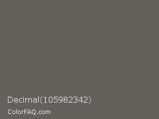 Decimal 105982342 Color is a normal yellow color and the nearest color is Chicago #5d5c58. Hex code #63615a and RGB value is rgb(99,97,90). In RGB color space, this color is composed of 39% red, 38% green, 35% blue, In CMYK color space, this color is composed of 0% cyan, 2% magenta, 9% yellow , 61% black , In HSL color space, this color has a hue angle of 47° , 5% saturation and 37% lightness.