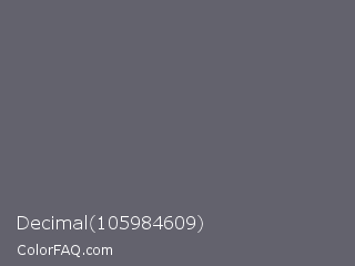 Decimal 105984609 Color is a normal indigo color and the nearest color is Mid Gray #5f5f6e. Hex code #63626d and RGB value is rgb(99,98,109). In RGB color space, this color is composed of 39% red, 38% green, 43% blue, In CMYK color space, this color is composed of 9% cyan, 10% magenta, 0% yellow , 57% black , In HSL color space, this color has a hue angle of 245° , 5% saturation and 41% lightness.