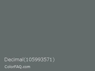 Decimal 105993571 Color is a normal cyan color and the nearest color is Corduroy #606e68. Hex code #636b6b and RGB value is rgb(99,107,107). In RGB color space, this color is composed of 39% red, 42% green, 42% blue, In CMYK color space, this color is composed of 7% cyan, 0% magenta, 0% yellow , 58% black , In HSL color space, this color has a hue angle of 180° , 4% saturation and 40% lightness.