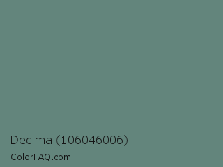 Decimal 106046006 Color is a normal cyan color and the nearest color is Viridian Green #678975. Hex code #63857c and RGB value is rgb(99,133,124). In RGB color space, this color is composed of 39% red, 52% green, 49% blue, In CMYK color space, this color is composed of 26% cyan, 0% magenta, 7% yellow , 48% black , In HSL color space, this color has a hue angle of 164° , 15% saturation and 45% lightness.