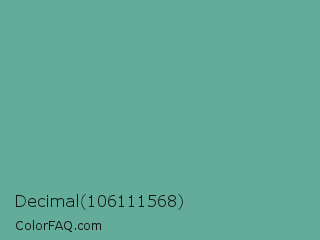 Decimal 106111568 Color is a normal cyan color and the nearest color is Polished Pine #5da493. Hex code #63ac9a and RGB value is rgb(99,172,154). In RGB color space, this color is composed of 39% red, 67% green, 60% blue, In CMYK color space, this color is composed of 42% cyan, 0% magenta, 10% yellow , 33% black , In HSL color space, this color has a hue angle of 165° , 31% saturation and 53% lightness.