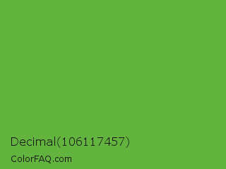 Decimal 106117457 Color is a normal green color and the nearest color is Green RYB #66b032. Hex code #63b33f and RGB value is rgb(99,179,63). In RGB color space, this color is composed of 39% red, 70% green, 25% blue, In CMYK color space, this color is composed of 45% cyan, 0% magenta, 65% yellow , 30% black , In HSL color space, this color has a hue angle of 101° , 48% saturation and 47% lightness.