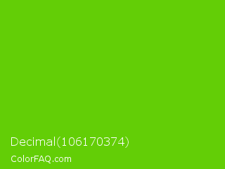 Decimal 106170374 Color is a normal green color and the nearest color is Lima #76bd17. Hex code #63ce06 and RGB value is rgb(99,206,6). In RGB color space, this color is composed of 39% red, 81% green, 2% blue, In CMYK color space, this color is composed of 52% cyan, 0% magenta, 97% yellow , 19% black , In HSL color space, this color has a hue angle of 92° , 94% saturation and 42% lightness.