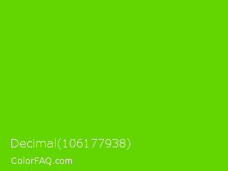 Decimal 106177938 Color is a normal green color and the nearest color is Alien Armpit #84de02. Hex code #63d500 and RGB value is rgb(99,213,0). In RGB color space, this color is composed of 39% red, 84% green, 0% blue, In CMYK color space, this color is composed of 54% cyan, 0% magenta, 100% yellow , 16% black , In HSL color space, this color has a hue angle of 92° , 100% saturation and 42% lightness.