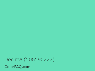 Decimal 106190227 Color is a light green color and the nearest color is Medium Aquamarine #66ddaa. Hex code #63e0b9 and RGB value is rgb(99,224,185). In RGB color space, this color is composed of 39% red, 88% green, 73% blue, In CMYK color space, this color is composed of 56% cyan, 0% magenta, 17% yellow , 12% black , In HSL color space, this color has a hue angle of 161° , 67% saturation and 63% lightness.