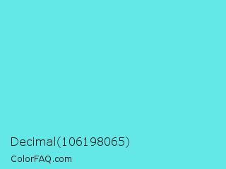 Decimal 106198065 Color is a light cyan color and the nearest color is Turquoise Blue #6cdae7. Hex code #63e7e7 and RGB value is rgb(99,231,231). In RGB color space, this color is composed of 39% red, 91% green, 91% blue, In CMYK color space, this color is composed of 57% cyan, 0% magenta, 0% yellow , 9% black , In HSL color space, this color has a hue angle of 180° , 73% saturation and 65% lightness.