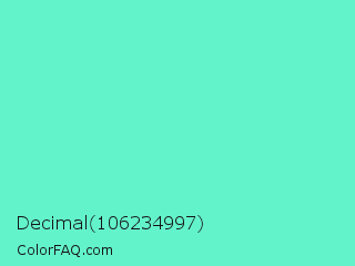Decimal 106234997 Color is a light green color and the nearest color is Aquamarine #7fffd4. Hex code #63f3cb and RGB value is rgb(99,243,203). In RGB color space, this color is composed of 39% red, 95% green, 80% blue, In CMYK color space, this color is composed of 59% cyan, 0% magenta, 16% yellow , 5% black , In HSL color space, this color has a hue angle of 163° , 86% saturation and 67% lightness.