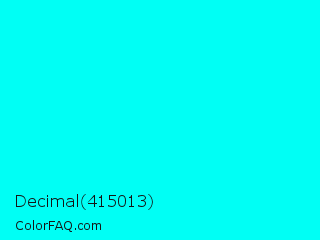 Decimal 415013 Color is a normal cyan color and the nearest color is Turquoise Blue #00ffef. Hex code #00fff5 and RGB value is rgb(0,255,245). In RGB color space, this color is composed of 0% red, 100% green, 96% blue, In CMYK color space, this color is composed of 100% cyan, 0% magenta, 4% yellow , 0% black , In HSL color space, this color has a hue angle of 178° , 100% saturation and 50% lightness.