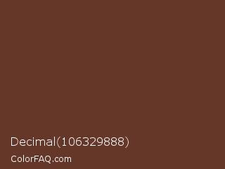 Decimal 106329888 Color is a dark color and the nearest color is Irish Coffee #5f3d26. Hex code #643728 and RGB value is rgb(100,55,40). In RGB color space, this color is composed of 39% red, 22% green, 16% blue, In CMYK color space, this color is composed of 0% cyan, 45% magenta, 60% yellow , 61% black , In HSL color space, this color has a hue angle of 15° , 43% saturation and 27% lightness.