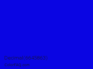 Decimal 6645863 Color is a normal indigo color and the nearest color is Medium Blue #0000cd. Hex code #0a05e3 and RGB value is rgb(10,5,227). In RGB color space, this color is composed of 4% red, 2% green, 89% blue, In CMYK color space, this color is composed of 96% cyan, 98% magenta, 0% yellow , 11% black , In HSL color space, this color has a hue angle of 241° , 96% saturation and 45% lightness.