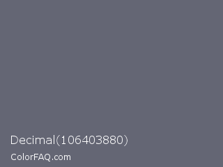 Decimal 106403880 Color is a normal blue color and the nearest color is Shuttle Gray #5f6672. Hex code #646674 and RGB value is rgb(100,102,116). In RGB color space, this color is composed of 39% red, 40% green, 45% blue, In CMYK color space, this color is composed of 14% cyan, 12% magenta, 0% yellow , 55% black , In HSL color space, this color has a hue angle of 233° , 7% saturation and 42% lightness.