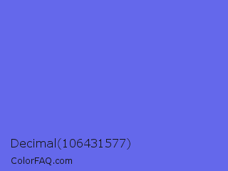 Decimal 106431577 Color is a light blue color and the nearest color is Very Light Blue #6666ff. Hex code #6468eb and RGB value is rgb(100,104,235). In RGB color space, this color is composed of 39% red, 41% green, 92% blue, In CMYK color space, this color is composed of 57% cyan, 56% magenta, 0% yellow , 8% black , In HSL color space, this color has a hue angle of 238° , 77% saturation and 66% lightness.