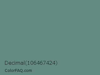 Decimal 106467424 Color is a normal cyan color and the nearest color is Steel Teal #5f8a8b. Hex code #648a84 and RGB value is rgb(100,138,132). In RGB color space, this color is composed of 39% red, 54% green, 52% blue, In CMYK color space, this color is composed of 28% cyan, 0% magenta, 4% yellow , 46% black , In HSL color space, this color has a hue angle of 171° , 16% saturation and 47% lightness.