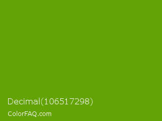 Decimal 106517298 Color is a normal green color and the nearest color is Limeade #6f9d02. Hex code #64a304 and RGB value is rgb(100,163,4). In RGB color space, this color is composed of 39% red, 64% green, 2% blue, In CMYK color space, this color is composed of 39% cyan, 0% magenta, 98% yellow , 36% black , In HSL color space, this color has a hue angle of 84° , 95% saturation and 33% lightness.