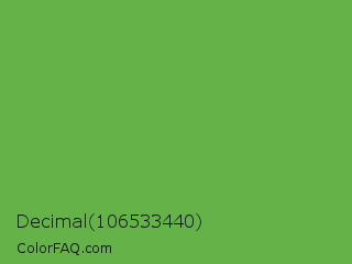 Decimal 106533440 Color is a normal green color and the nearest color is Green RYB #66b032. Hex code #64b248 and RGB value is rgb(100,178,72). In RGB color space, this color is composed of 39% red, 70% green, 28% blue, In CMYK color space, this color is composed of 44% cyan, 0% magenta, 60% yellow , 30% black , In HSL color space, this color has a hue angle of 104° , 42% saturation and 49% lightness.