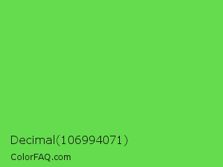 Decimal 106994071 Color is a normal green color and the nearest color is Mantis #74c365. Hex code #64dc4d and RGB value is rgb(100,220,77). In RGB color space, this color is composed of 39% red, 86% green, 30% blue, In CMYK color space, this color is composed of 55% cyan, 0% magenta, 65% yellow , 14% black , In HSL color space, this color has a hue angle of 110° , 67% saturation and 58% lightness.