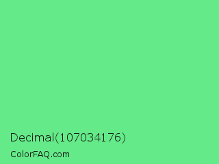 Decimal 107034176 Color is a light green color and the nearest color is Very Light Malachite Green #64e986. Hex code #64ea88 and RGB value is rgb(100,234,136). In RGB color space, this color is composed of 39% red, 92% green, 53% blue, In CMYK color space, this color is composed of 57% cyan, 0% magenta, 42% yellow , 8% black , In HSL color space, this color has a hue angle of 136° , 76% saturation and 65% lightness.