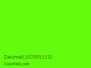Decimal 107051113 Color is a normal green color and the nearest color is Bright Green #66ff00. Hex code #64fb0d and RGB value is rgb(100,251,13). In RGB color space, this color is composed of 39% red, 98% green, 5% blue, In CMYK color space, this color is composed of 60% cyan, 0% magenta, 95% yellow , 2% black , In HSL color space, this color has a hue angle of 98° , 97% saturation and 52% lightness.