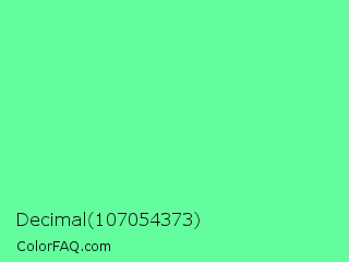 Decimal 107054373 Color is a light green color and the nearest color is Very Light Malachite Green #64e986. Hex code #64fd9d and RGB value is rgb(100,253,157). In RGB color space, this color is composed of 39% red, 99% green, 62% blue, In CMYK color space, this color is composed of 60% cyan, 0% magenta, 38% yellow , 1% black , In HSL color space, this color has a hue angle of 142° , 97% saturation and 69% lightness.