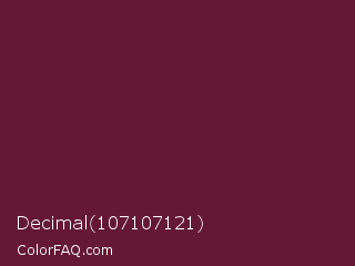 Decimal 107107121 Color is a dark rose color and the nearest color is Wine Berry #591d35. Hex code #651833 and RGB value is rgb(101,24,51). In RGB color space, this color is composed of 40% red, 9% green, 20% blue, In CMYK color space, this color is composed of 0% cyan, 76% magenta, 50% yellow , 60% black , In HSL color space, this color has a hue angle of 339° , 62% saturation and 25% lightness.
