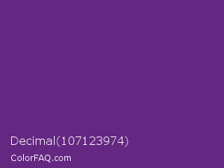Decimal 107123974 Color is a normal purple color and the nearest color is Eminence #6c3082. Hex code #652882 and RGB value is rgb(101,40,130). In RGB color space, this color is composed of 40% red, 16% green, 51% blue, In CMYK color space, this color is composed of 22% cyan, 69% magenta, 0% yellow , 49% black , In HSL color space, this color has a hue angle of 281° , 53% saturation and 33% lightness.