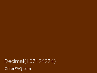 Decimal 107124274 Color is a very dark orange color and the nearest color is Carnaby Tan #5c2e01. Hex code #652900 and RGB value is rgb(101,41,0). In RGB color space, this color is composed of 40% red, 16% green, 0% blue, In CMYK color space, this color is composed of 0% cyan, 59% magenta, 100% yellow , 60% black , In HSL color space, this color has a hue angle of 24° , 100% saturation and 20% lightness.
