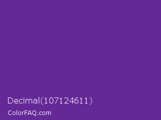 Decimal 107124611 Color is a normal purple color and the nearest color is Rebecca Purple #663399. Hex code #652997 and RGB value is rgb(101,41,151). In RGB color space, this color is composed of 40% red, 16% green, 59% blue, In CMYK color space, this color is composed of 33% cyan, 73% magenta, 0% yellow , 41% black , In HSL color space, this color has a hue angle of 273° , 57% saturation and 38% lightness.