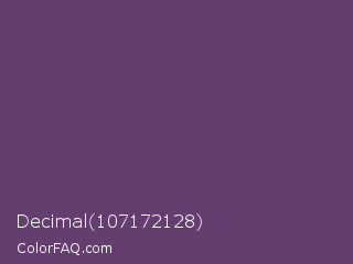 Decimal 107172128 Color is a normal purple color and the nearest color is Imperial #602f6b. Hex code #653e70 and RGB value is rgb(101,62,112). In RGB color space, this color is composed of 40% red, 24% green, 44% blue, In CMYK color space, this color is composed of 10% cyan, 45% magenta, 0% yellow , 56% black , In HSL color space, this color has a hue angle of 287° , 29% saturation and 34% lightness.