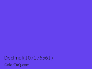 Decimal 107176561 Color is a normal indigo color and the nearest color is Majorelle Blue #6050dc. Hex code #6542ef and RGB value is rgb(101,66,239). In RGB color space, this color is composed of 40% red, 26% green, 94% blue, In CMYK color space, this color is composed of 58% cyan, 72% magenta, 0% yellow , 6% black , In HSL color space, this color has a hue angle of 252° , 84% saturation and 60% lightness.