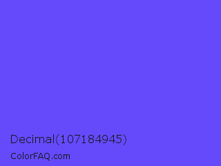Decimal 107184945 Color is a light indigo color and the nearest color is Very Light Blue #6666ff. Hex code #654afb and RGB value is rgb(101,74,251). In RGB color space, this color is composed of 40% red, 29% green, 98% blue, In CMYK color space, this color is composed of 60% cyan, 71% magenta, 0% yellow , 2% black , In HSL color space, this color has a hue angle of 249° , 96% saturation and 64% lightness.