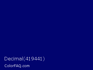 Decimal 419441 Color is a very dark blue color and the nearest color is Navy Blue #000080. Hex code #01046f and RGB value is rgb(1,4,111). In RGB color space, this color is composed of 0% red, 2% green, 44% blue, In CMYK color space, this color is composed of 99% cyan, 96% magenta, 0% yellow , 56% black , In HSL color space, this color has a hue angle of 238° , 98% saturation and 22% lightness.