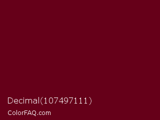 Decimal 107497111 Color is a very dark red color and the nearest color is Bordeaux #5c0120. Hex code #660019 and RGB value is rgb(102,0,25). In RGB color space, this color is composed of 40% red, 0% green, 10% blue, In CMYK color space, this color is composed of 0% cyan, 100% magenta, 75% yellow , 60% black , In HSL color space, this color has a hue angle of 345° , 100% saturation and 20% lightness.