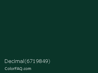 Decimal 6719849 Color is a very dark green color and the nearest color is Bottle Green #093624. Hex code #0a3529 and RGB value is rgb(10,53,41). In RGB color space, this color is composed of 4% red, 21% green, 16% blue, In CMYK color space, this color is composed of 81% cyan, 0% magenta, 23% yellow , 79% black , In HSL color space, this color has a hue angle of 163° , 68% saturation and 12% lightness.
