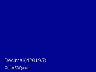Decimal 420195 Color is a dark blue color and the nearest color is Dark Blue #00008b. Hex code #010593 and RGB value is rgb(1,5,147). In RGB color space, this color is composed of 0% red, 2% green, 58% blue, In CMYK color space, this color is composed of 99% cyan, 97% magenta, 0% yellow , 42% black , In HSL color space, this color has a hue angle of 238° , 99% saturation and 29% lightness.